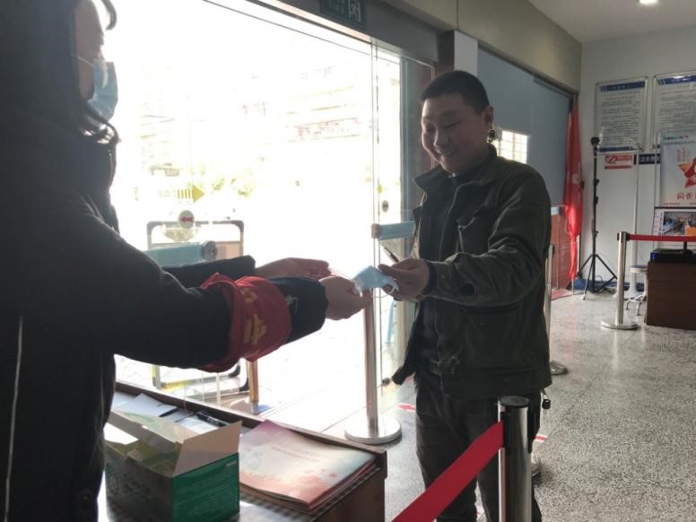 “請留步稍等!我們這邊將自己的備用口罩,送您一只!疫情還未結(jié)束,防疫不能放松。下次進(jìn)大廳請您記得一定要佩戴口罩!”