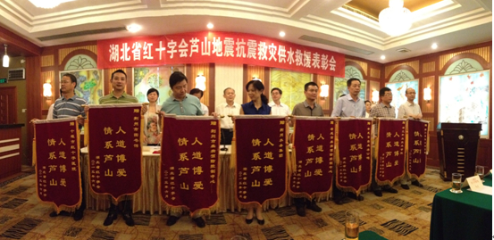 6月3日,湖北省紅十字會(huì)蘆山地震抗震救災(zāi)供水救援表彰會(huì)在武漢召開。表彰會(huì)上,荊門市供水總公司黨委書記陳永根作典型發(fā)言,荊門市供水總公司被授“情系蘆山  人道博愛”錦旗,參與供水救援的隊(duì)員彭華、黃洋獲得嘉獎(jiǎng),榮獲廬山地震抗震救災(zāi)先進(jìn)個(gè)人稱號(hào)。