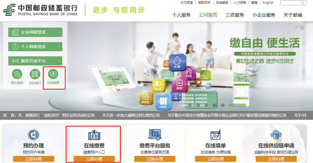 登錄繳費(fèi)用戶登錄“中國(guó)郵政儲(chǔ)蓄銀行”官網(wǎng)(http://www.psbc.com/cn/),點(diǎn)擊“服務(wù)快捷通道-在線繳費(fèi)”進(jìn)入,無(wú)需注冊(cè)及登錄。