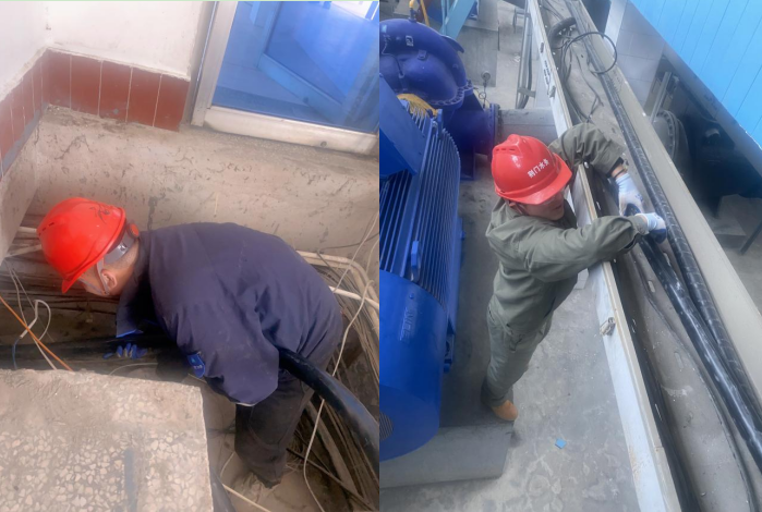 從中壓泵房變頻柜敷設200多米的電纜至送水泵房泵機,途徑1米高的電纜隧道和5米高的電纜夾層,由于隧道內部空間狹小,人在其中只能彎著腰蹲著作業(yè),多處轉彎,也給工作帶來不小的難度,但大家充分發(fā)揮水務人“特別能戰(zhàn)斗”的精神,齊心協(xié)力,最終歷時3小時完成任務。