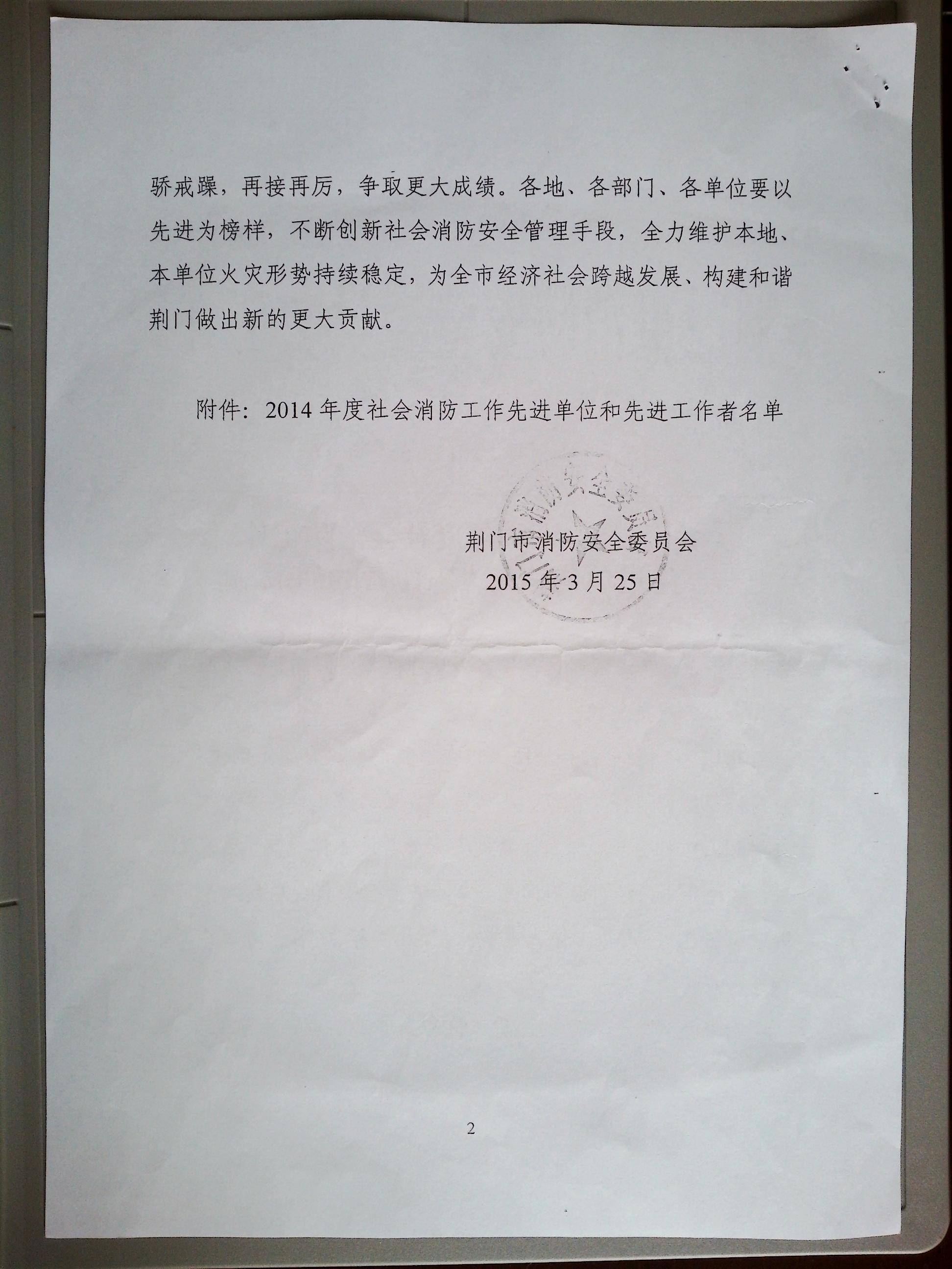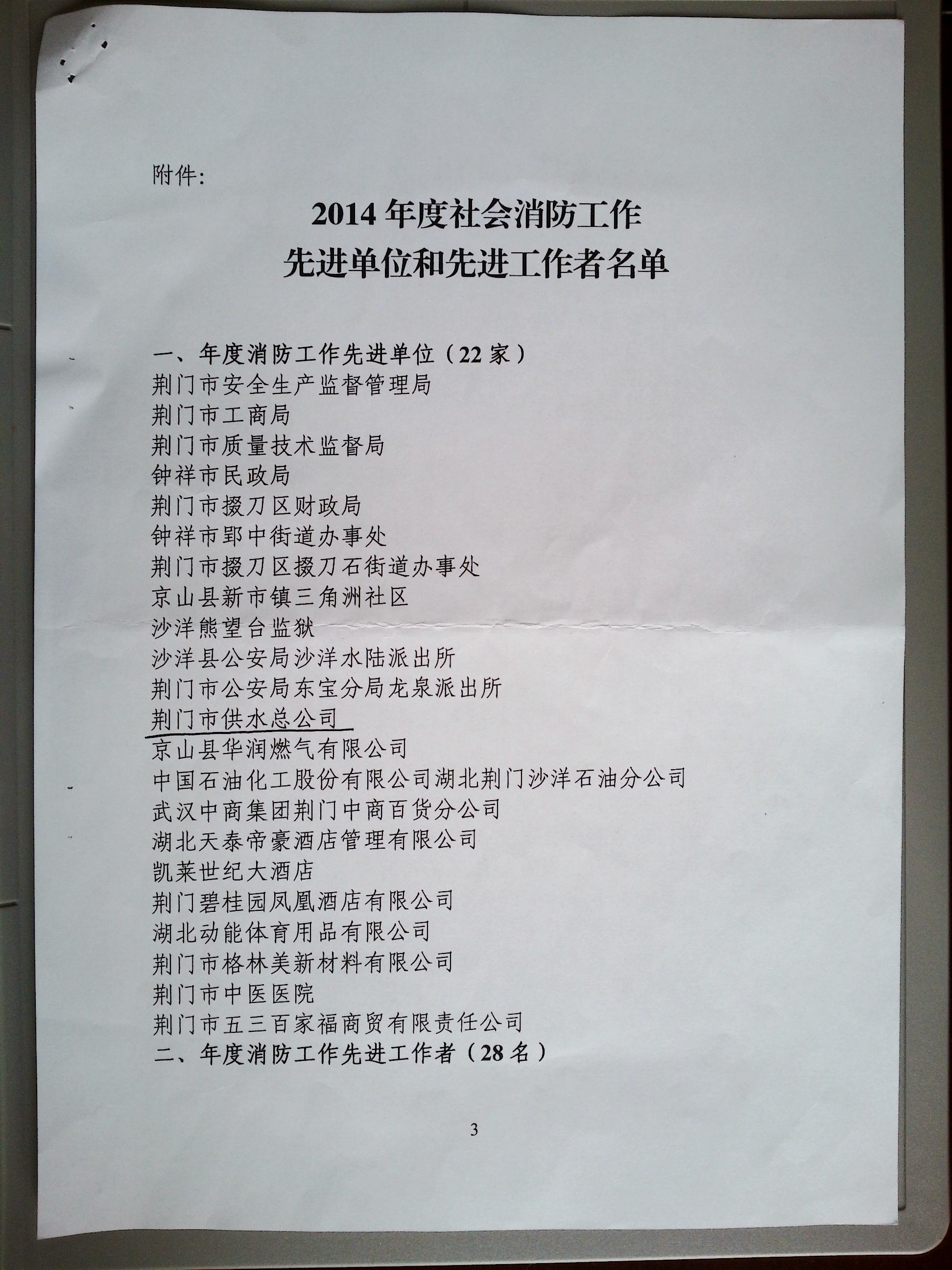 榮譽快訊;公司獲2014年度消防工作先進單位