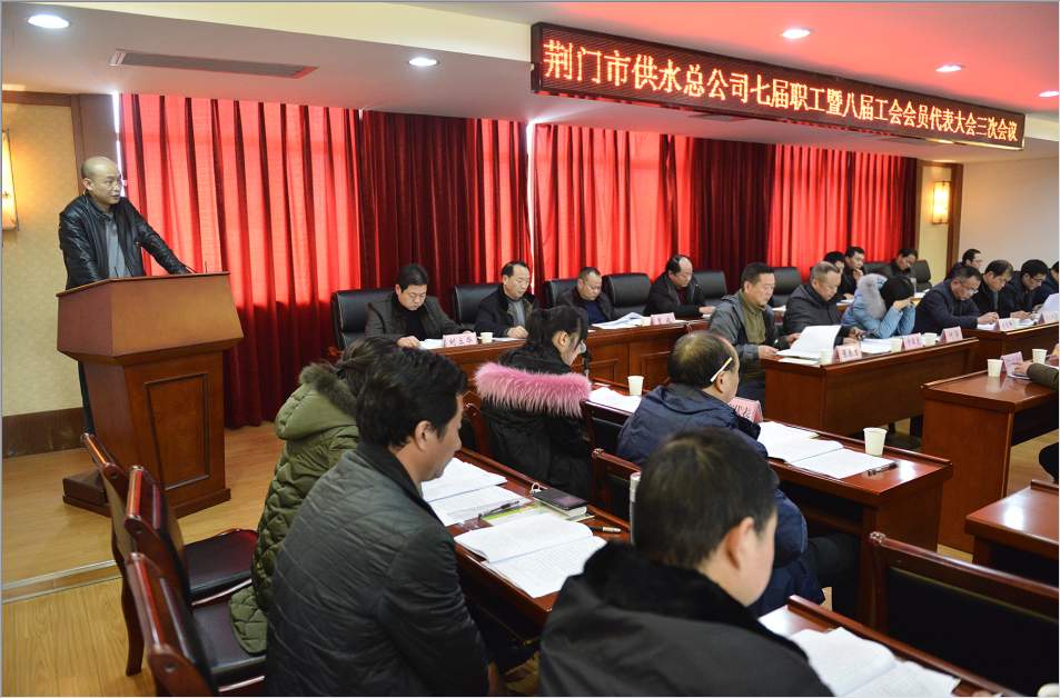 會議在莊嚴的國歌聲中開幕。公司黨委書記、總經(jīng)理陳永根作了《2016年度公司工作報告》,認真總結(jié)了2016年度取得的各項成績;供水設施建設投資體制理順、5條道路供水管道改遷提前完成、國賓酒店環(huán)評獲批;管黨治黨高度前所未有、項目建設力度規(guī)??涨?、公司主輔業(yè)產(chǎn)值連續(xù)五年雙過億,總額首次突破3億元等。客觀分析了當前企業(yè)發(fā)展存在的機會和挑戰(zhàn),并對2017年度的工作作出了展望。黨委委員、工會主席馬兆芳,黨委委員、總會計師劉高軼分別作了《2016年度工會委員會工作報告》、《荊門市供水總公司2016年度財務預算執(zhí)行及2017年財務預算草案編制報告》、《荊門市供水總公司2016年度工會經(jīng)費執(zhí)行及2017年工會經(jīng)費預算情況報告》。職工代表提案審查小組組長卞軍虎對七屆職工暨八屆工會會員代表大會二次會議職工代表提案辦理情況作了報告,七屆職工暨八屆工會會員代表大會二次會議共收到34份職工提案,實際需要回復和辦理的提案為32份,已辦結(jié)的有27份,正在落實的5份,報告中對正在落實的提案進行了說明。工會副主席張春生對本次會議征集職工代表提案作了報告,本次會議共收到19份提案,其中涉及經(jīng)營管理的5份,技術(shù)改革的1份,教育培訓的1份,薪資福利待遇的12份。會議期間,與會代表給予六個報告充分肯定,圍繞各項工作報告,進行了熱烈討論,提出了許多寶貴的建議和意見。