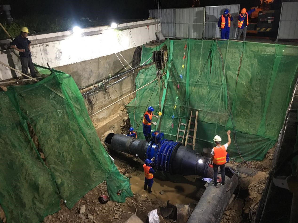 20日晚10時(shí),項(xiàng)目現(xiàn)場(chǎng)管理人員強(qiáng)化工序銜接,緊盯現(xiàn)場(chǎng)監(jiān)督,施工作業(yè)人員挑燈夜戰(zhàn),施工隊(duì)伍兵分三路,密切協(xié)調(diào)配合,分別對(duì)DN1200、DN1000鋼管共5處碰頭點(diǎn)進(jìn)行施工,管道切割、排水、吊裝、安裝閥門、焊接……施工現(xiàn)場(chǎng)井然有序,一道道工序推進(jìn)有條不紊,不一會(huì)兒工人們的汗水都濕透了全身。21日凌晨2:00突降暴雨,施工人員“硬核”表現(xiàn),克服惡劣天氣的影響,在水中連續(xù)辛勤作業(yè)近10個(gè)小時(shí),碰頭任務(wù)于218時(shí)順利完工。