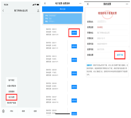 用戶在繳費成功后,只需關注“荊門市供水總公司”微信公眾號或登錄網上營業(yè)廳,進入電子發(fā)票模塊,即可查詢、申領、下載打印水費電子發(fā)票。目前,電子發(fā)票系統(tǒng)運行平穩(wěn)順利。